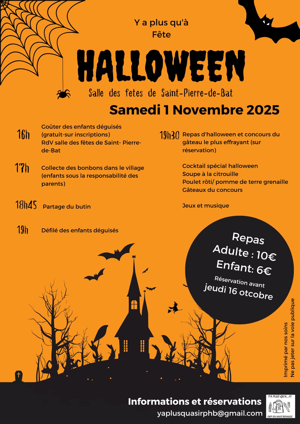 Y a plus qu'a !!! l'association de parents d'élèves des écoles de Mourens, Gornac et Saint- Pierre de Bat organise la fête d'halloween. C'est l'occasion pour les enfants d'enfiler leurs plus effrayants déguisements et d'être quelqu'un d'autre durant une journée. Mais surtout de récolter quelques friandises auprès des maisons. Au programme et sur inscription goûter, chasse aux bonbons dans les rues de Saint-Pierre de Bat et partage du butin. Défilé déguisement spécial enfant. Puis, la soirée se poursuit en musique avec un repas et concours du meilleur gâteau d'halloween (sur réservation)
